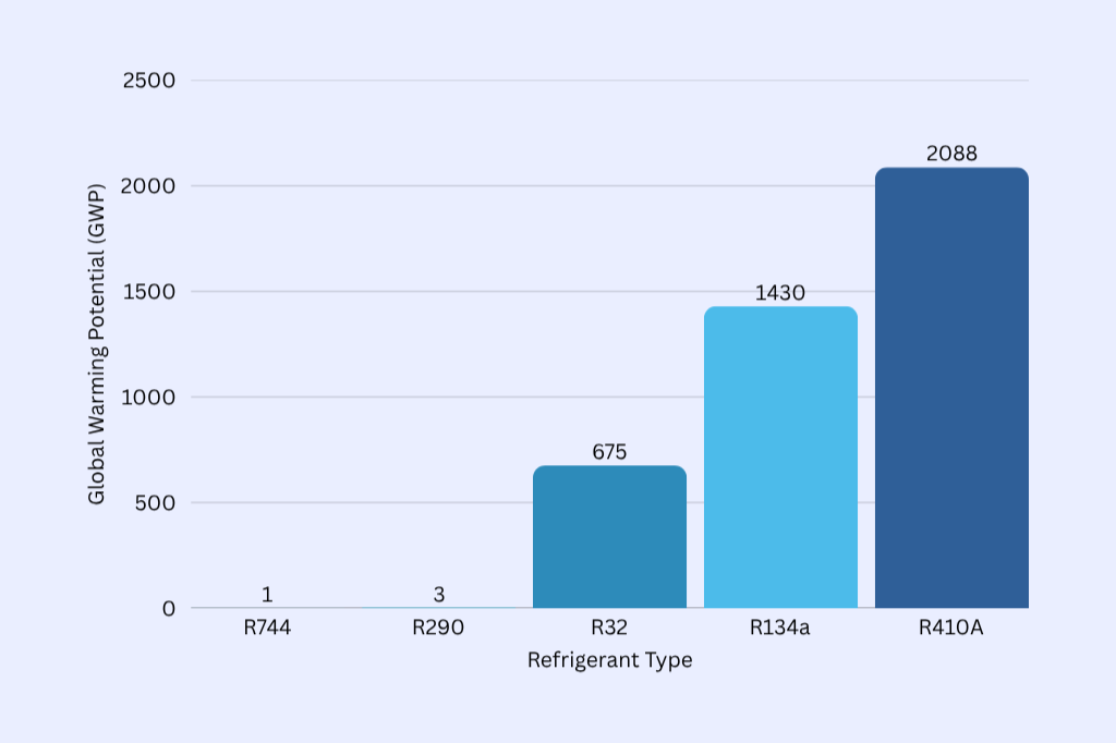 Different refrigerants have different climate impacts, measured by Global Warming Potential (GWP).